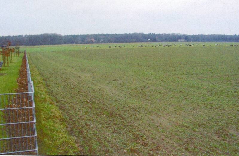 DZ Wiskey (W) net ten noordwesten van Wesel. De landingsplaats van de parachutisten van het US 507th Parachute Infantry Regiment. De bomen op de verre achtergrond van de foto staan aan de zuidelijke rand van het Diersfordter Woud. Het spoor waarover het 3e bataljon van het regiment oprukte naar kasteel Diersfordt komt midden op de achtergrond het bos in.