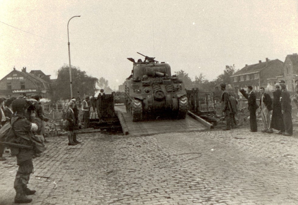 Nadat de Baileybrug gereed was konden ook voertuigen de brug overrijden, zoals deze Amerikaanse Sherman tank op 19 september 1944