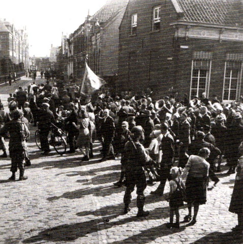 Nederlandse jongeren helpen militairen van de Amerikaanse luchtlandingstroepen onder leiding van Lieutenant General Lewis H. Brereton