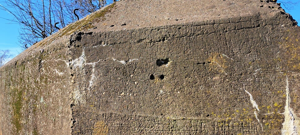 Aan de buitenkant is duidelijk te zien dat de kazemat zwaar onder vuur heeft gelegen op zowel 10 mei 1940 als op 9 april 1945, voordat de brug werd veroverd door de Belgische SAS.