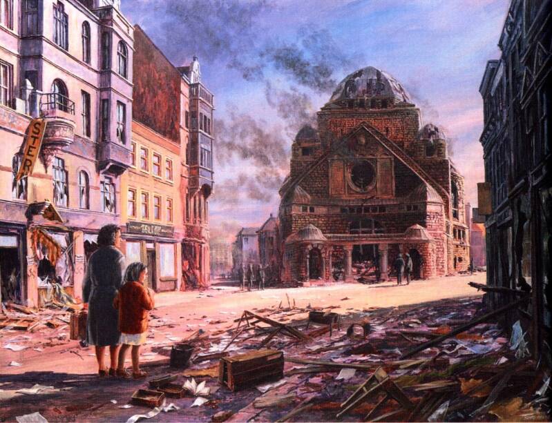 Brandende Joodse synagoge. De brandweer stond er bij en keek er naar. Bewust werd alleen ingezet op het beschermen van omliggende percelen terwijl ze de Joodse synagogen liet afbranden.