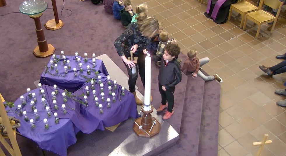 Aan de kinderen wordt uitgelegd wat het betekent kaarsen aan te steken voor de overledenen in het afgelopen kerkelijk jaar.