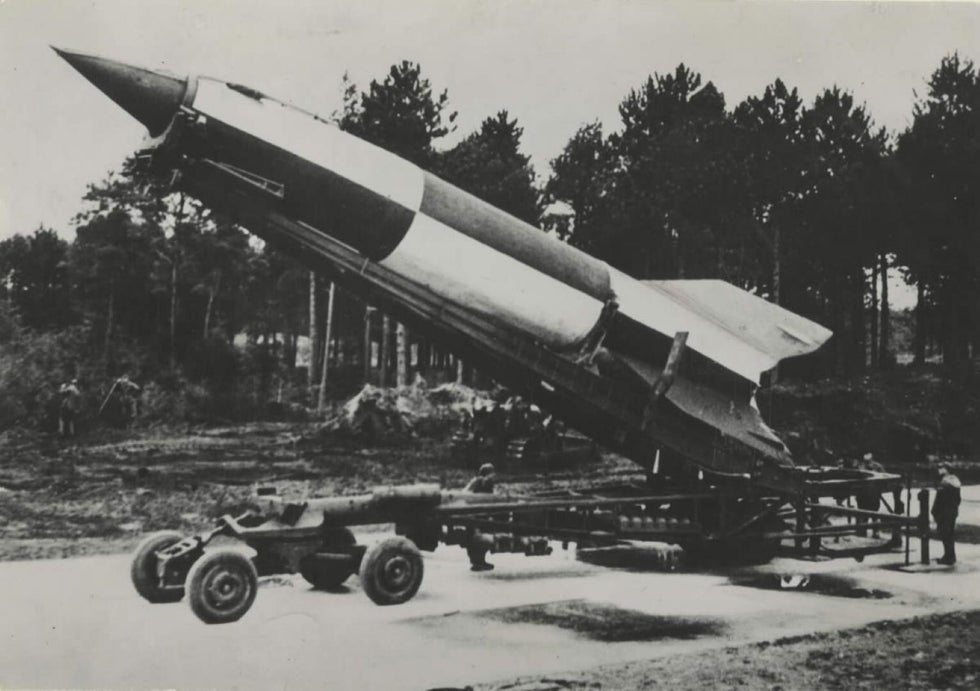 Testlancering van een V2, ontwikkeld door de Duitse, later tot Amerikaan genaturaliseerde ruimtevaartgoeroe Werner von Braun. Hier is hij te zien in Peenemunde temidden van de nazi-kopstukken Dornberger, Olbricht en Leeb. Aanvankelijk had Hitler weinig belangstelling voor het V2 project, maar werd pas enthousiast toen Von Braun een oplossing had gevonden voor de tot dan toe mislukte testlanceringen: het koelen van de brandstofleidingen van de raket, want door de hitte van de brandstofleidingen werden de wanden van de raket vervormd, waardoor het uit de koers raakte en neerstortte. Toen eenmaal het proces gelukt was, werden de V2's met succes gelanceerd en werd Hitler enthousiast. De V2's werden afgeschoten op Antwerpen en Londen. Aanvankelijk vanaf vaste lanceerplaatsen, maar toen de geallieerden oprukten in Frankrijk, ook vanaf mobiele lanceerplatforms.
