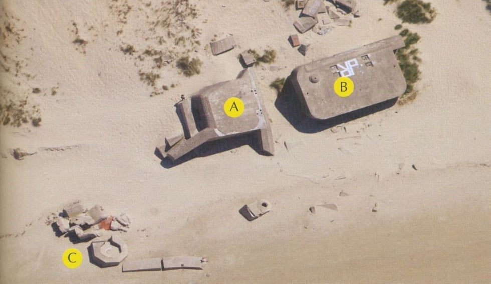 In de loop van de tijd is de Atlantikwall deels onder het zand verdwenen. Deze bunker ligt ten zuiden van Boulogne, onderdeel van Stutzpunkt Obelisk. De twee grote bunkers zijn een R612 (A) Schartenstand für Land und Sturmgeschütze, een kazemat met een groot kanon en een R502 (B) Doppelgruppenunterstand, een personeelsbunker. Links is een stelling voor een 5 cm KwK (C).