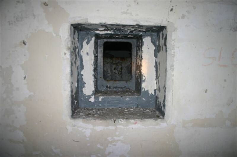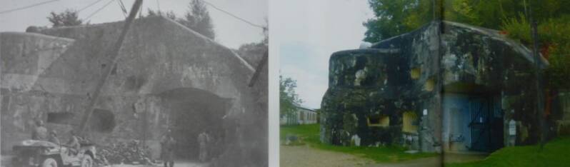 Fort Eben-Emael in september 1944 en nu. Dit is de hoofdingang, beschermd door een antitankwapen en machinegeweren.