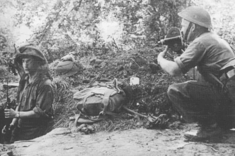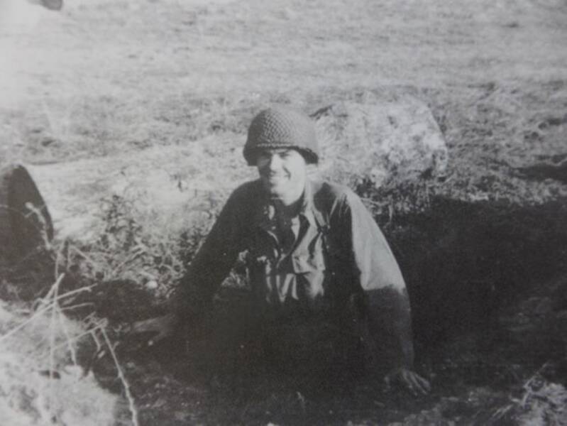 Dr van Heely was Battalion Assistent bij de 113th Field Artillery. Hij maakte dit gat en zocht daarin dekking toen de granaten om hem heen gierden bij Mortain, Frankrijk, augustus 1944.
