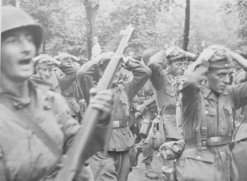 Luitenant. Klaptocz van de 10th Dragoons, Poolse 1e Pantserdivisie en majoor Leonard Dull van de US 90th Inf Div in Chambois, augustus 1944, nadat de geallieerde verbinding de lus rond de Zak van Falaise had gesloten. Daardoor zaten de overblijfselen van het Duitse Zevende Leger in de val. Klaptocz sneuvelde later in Nederland.