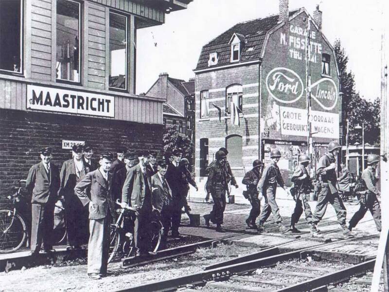 Amerikaanse infanteristen passeren het station van Maastricht.