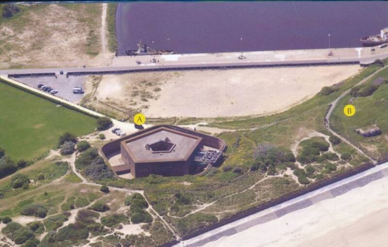 Ten westen van de haveningang van Oostende ligt Fort Napoleon (A), gebouwd in 1811. In beide wereldoorlogen was dit het hoofdkwartier van de Duitse artillerie in het gebied. De haven was goed verdedigd. Bij (B) de meest oostelijke kazemat van Batterij Hundius; in deze R671 stond 10,5 cm. Na de oorlog werd de versterking omgebouwd tot een transmissiecentrum van de Belgische marine, die het op haar beurt in 1983 in bruikleen gaf aan het Koninklijk Marine Kadettenkorps.