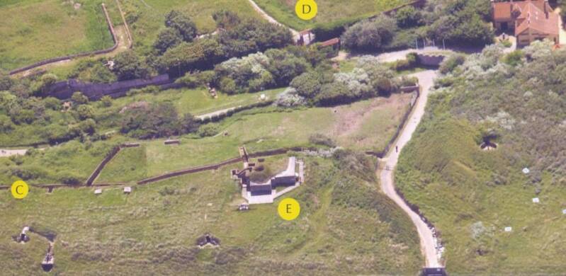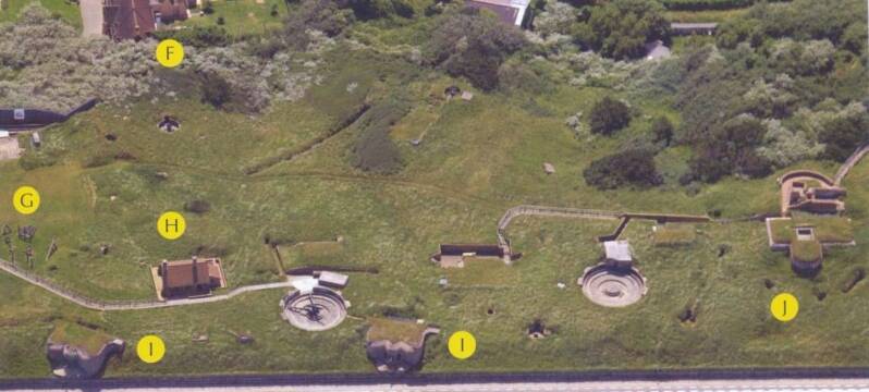 Het schitterende museum Domein Raversijde, ten westen van de luchthaven Oostende, omvat ruim 60 bunkers en batterijen uit beide wereldoorlogen. De onderdelen zijn geconserveerd door prins Karel (1903-1983), graaf van Vlaanderen en regent van België 1944-1950, die hier vanaf 1950 woonde (huis bij F) D is de ingang tot het museum. Tot de bezienswaardigheden behoort de Aken Batterij uit de WOI (C); (E) is een vuurleidingspost uit WOI met een afstandmeter ervoor. De WOII-batterij heette oorspronkelijk MKB Saltzwedel, later Tirpitz. G Verschillende anti-tank- en antilandingsvaartuigobstakels gebruikt op de stranden van de Atlantikwall. H Huis van de batterijcommandant. I twee van de vier R671-bunkers. J WOII-observatiebunker en commandopost.