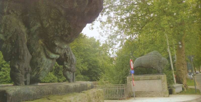 Canadabrug te Brugge. Hier bevindt zich een gedenkplaat ter nagedachtenis aan de Canadese troepen die Brugge bevrijdden op 12 september 1944. De twee bizons staan voor de XIIth Manitoba Dragoons.