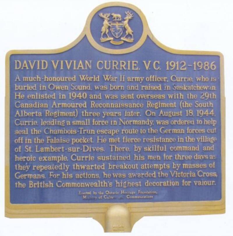 Majoor David Currie verdiende het Victoria Cross in de slag om de Zak van Falaise in dienst van het South Alberta Regiment. De plaquette bevindt zich in Owen Sound, Canada.