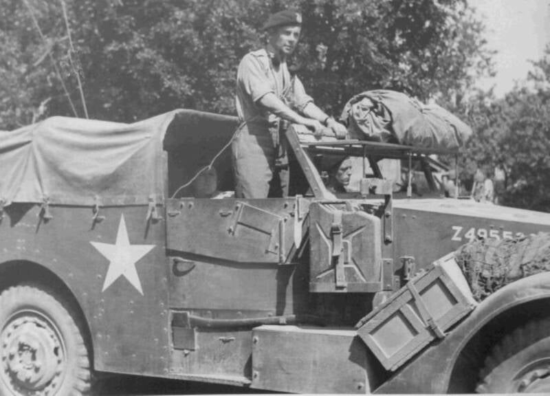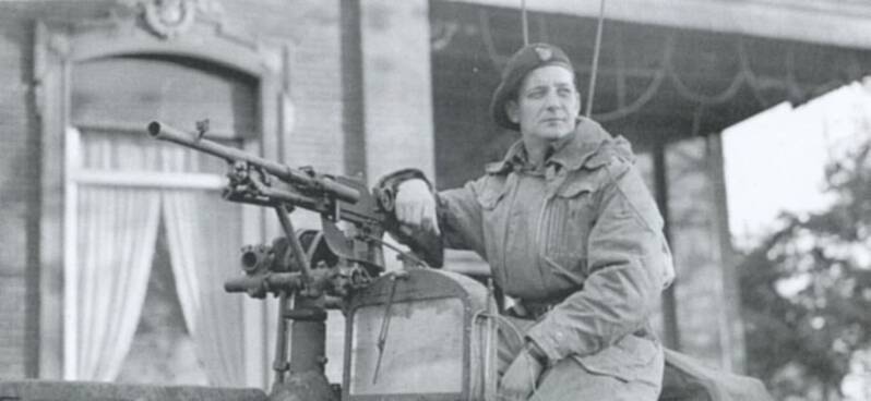 Majoor David Currie in een Humber MKI-verkenningswagen, eind 1944. Het wapen is een Brengun.