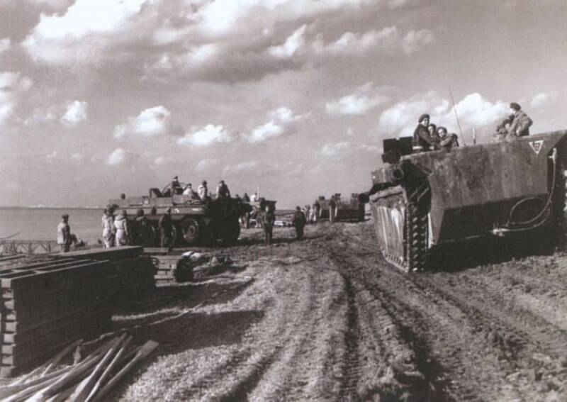 Het antwoord op de omstandigheden waren gespecialiseerde voertuigen; hier passeert een kolonne Alligator LVT's Terrapin-amfibievoertuigen de schelde, 13 oktober 1944.