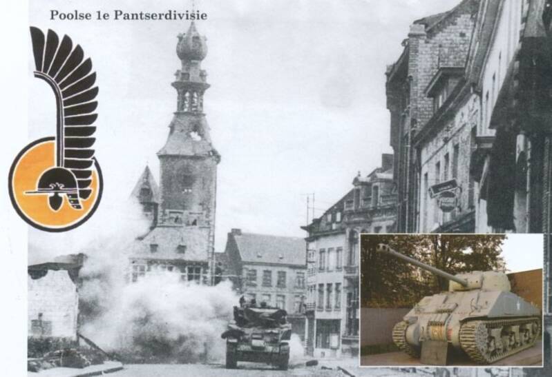 De Poolse 1e Pantserdivisie in Tielt, België tegen een achtergrond die nu nog steeds herkenbaar is. In de inzet de Sherman Firefly die de divisie aan de stad schonk.