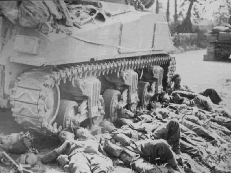 Uitgeschakelde Duitse tanks tijdens Operatie Lüttich bij Mortain.