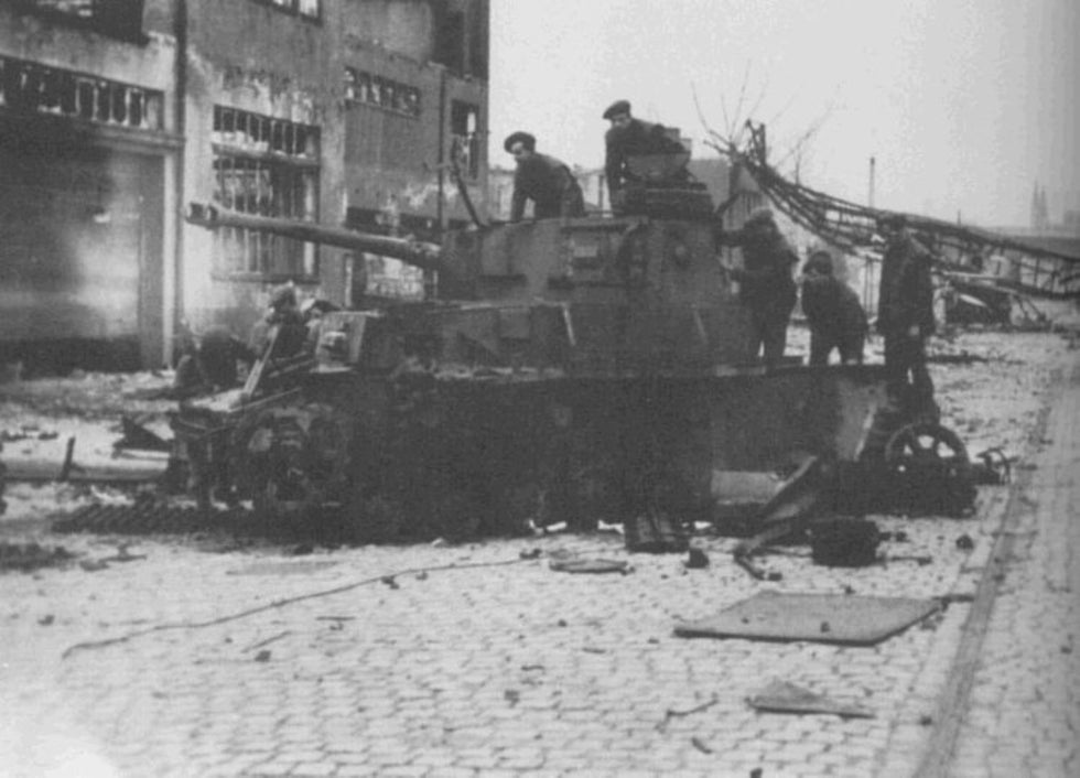 Deze Panzer MK IV is onschadelijk gemaakt door de verdedigers van de brug bij Arnhem. Op de achtergrond zijn de twee torens van de Walburgiskerk te zien.