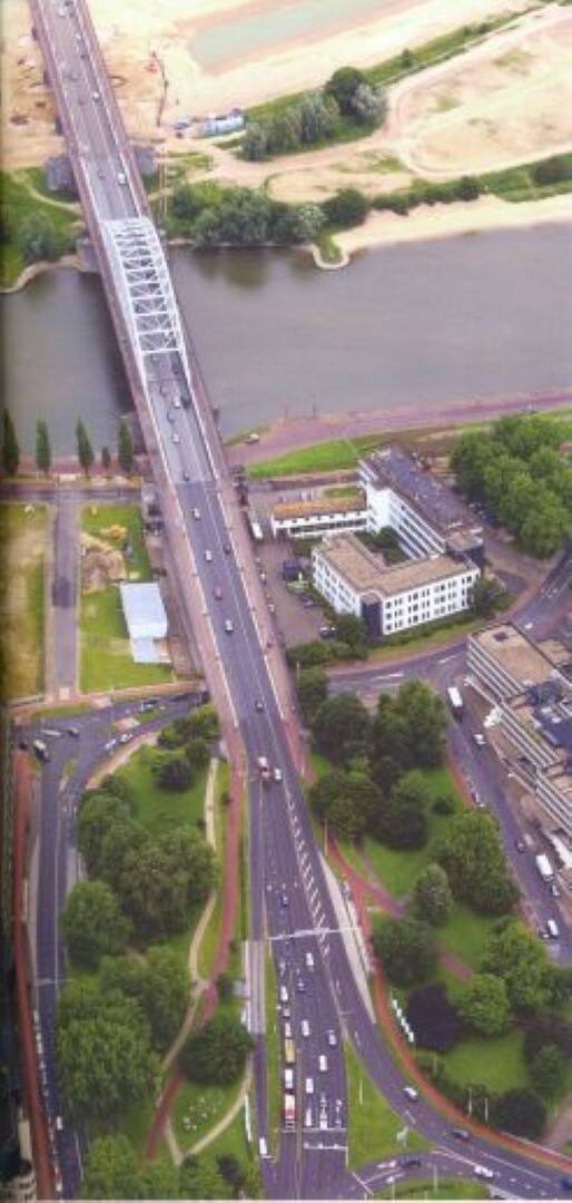 Zicht op de Rijnbrug bij Arnhem toen en nu. Vanaf 1977 het het de John Frostbrug, naar de commandant van de Britse troepen. De huidige brug is voltooid in 1948, nadat de oude in oktober 1944 was gebombardeerd. Het beeld van toen is van na de slag. Let op de bunker rechts, waar op de 17e fel om gevochten was.