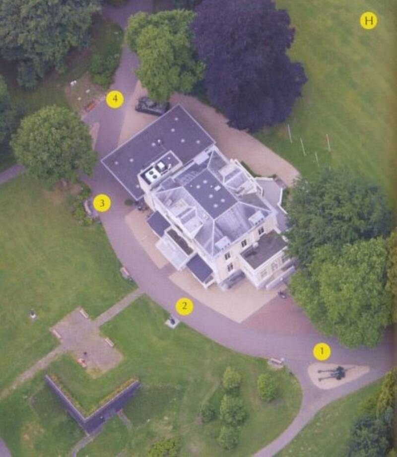 Luchtfoto van Hartenstein met 1 één van de twee 17 pdr Antitankkanonnen die bewaard zijn 2 Het monument ter nagedachtenis aan de Britse, Commonwealth en Amerikaanse luchtmachtbemanningen die zijn omgekomen tijdens operatie Market Garden. 3 'Gelderland-Monument' 4 een Sherman V Argyle van de 4th Tp, A Sqn, 2nd Tank Regt, Canadian 5th Arm Div. Deze tanks hielpen in april 1945 de Duitse troepen ten westen van Arnhem te verdrijven.