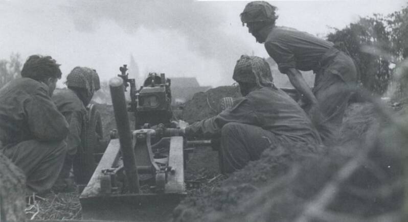 Deze foto van het mortierteam vn 23 Mortar Pl. Support, Coy, 1st Border Regt is genomen op 21 september 1944