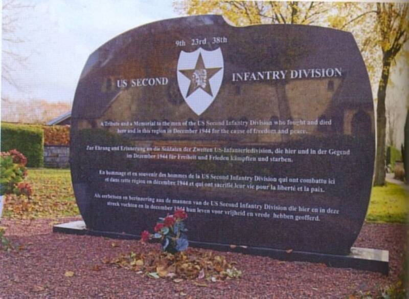 Gedenktekens voor de 106th Division en het 168th ECB. De 106th was omsingeld in de Schnee Eifel en twee regimenten werden gevangen genomen; de rest sloot zich aan bij de verdedigers van Sank Vith. |Het 168th ECB was een onderdeel van de Combat Command B 7th Armd Div.