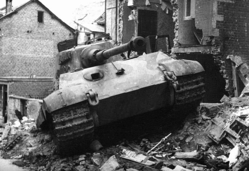 Een Panther van Das Reich, uitgeschakeld door het 289th Regt, 75th Inf Div bij Grandmenil. De divisie kwam op 22 november in Engeland aan en haastte zich op 23 december naar de Ourthe. Op 5 januari ging zij verder naar Grandmenil. Zij loste op 8 januari de 82nd Airborne af aan de Salm en ging op 17 januari in de aanval om Vielsalm in te nemen.