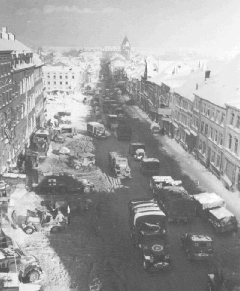 Alles nog rustig in Sankt Vith in september, twee maanden voor het offensief. Een 7th Armored halftrack ridt door de straten.