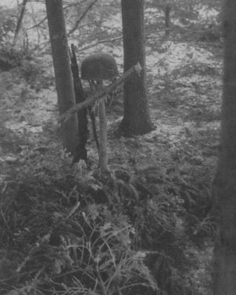 Veldgraf van een gesneuvelde Duitse Fallschirmjäger van de 5e Division, onderdeel van de Duitse Zevende Leger, ten oosten van Bastogne.
